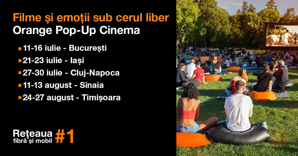 Orange Pop-Up Cinema, un eveniment de succes în rândul consumatorilor din România, aflat la a patra ediție, repornește la drum spre 5 orașe: București, Iași, Cluj-Napoca, Sinaia și Timișoara. Inițiativa Orange, un susținător tradițional al cinematografiei, mută sălile de film în aer liber pentru a aduce mai aproape de cinefili câteva ore de distracție și relaxare alături de prieteni sau familie. Ca în fiecare an, toate încasările din prețul biletelor vor merge spre programele de educație digitală ale Fundației Orange.
