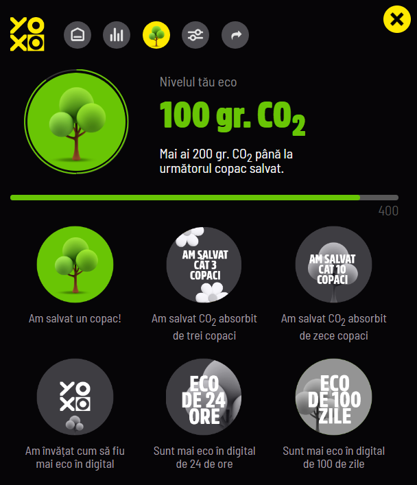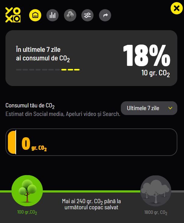 - să vadă numărul de grame de CO2 economisit, dar și câte grame de CO2 mai trebuie să economisească pentru a salva unul sau mai mulți copaci.