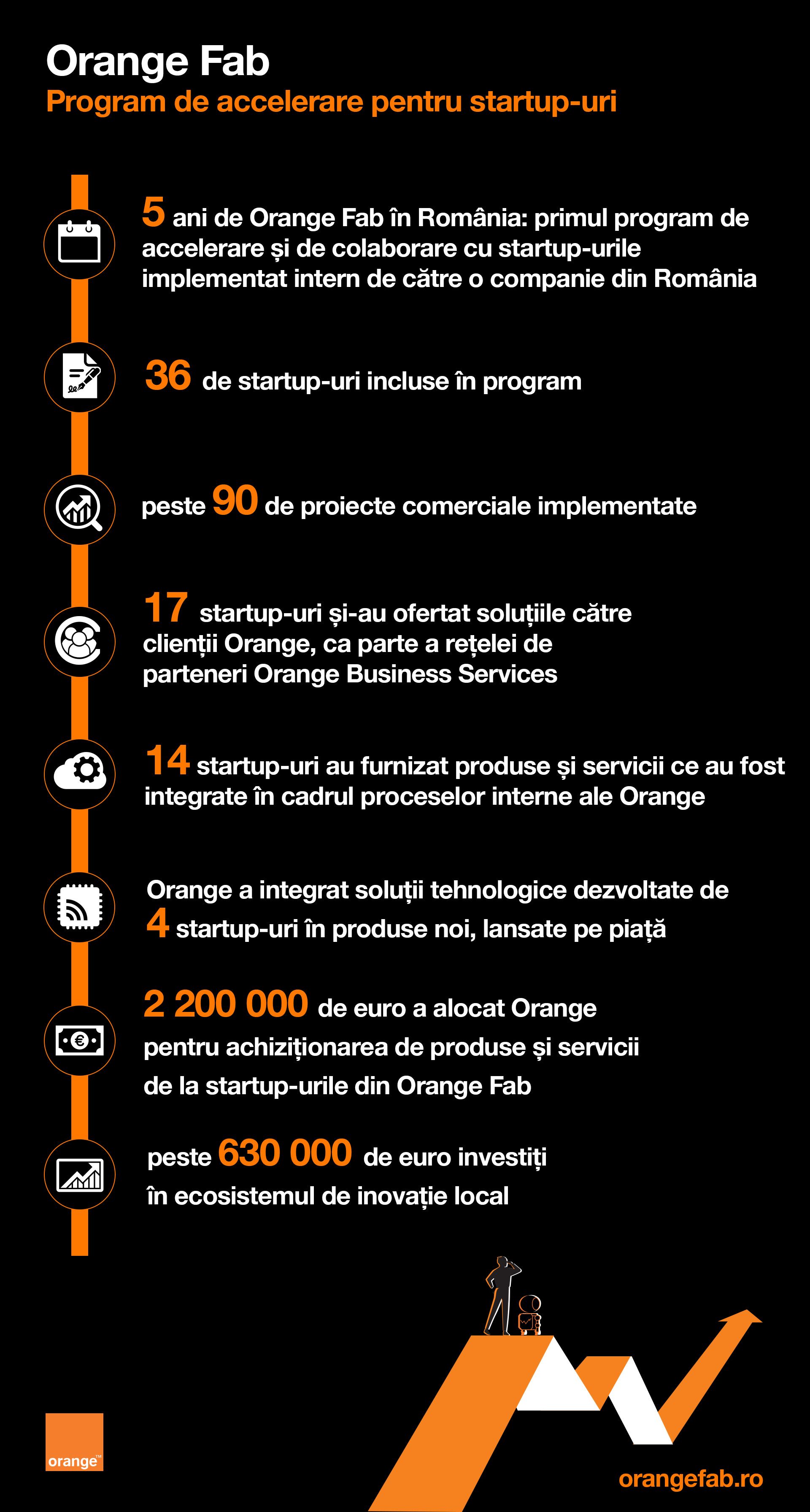Lansat în 2017, Orange Fab este primul program de accelerare și de colaborare cu startup-urile implementat intern de către o companie din România. În cei 5 ani de activitate, Orange România a achiziționat produse și servicii în valoare de 2,2 milioane de euro de la startup-urile tehnologice incluse în program.