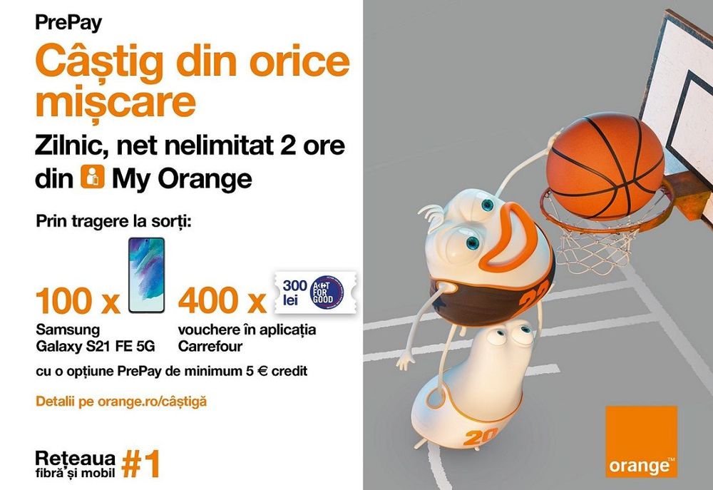 În plus, prin tragere la sorți, clienții pot câștiga unul din cele 100 de telefoane Samsung Galaxy S21 FE 5G sau unul din cele 400 vouchere a câte 300 lei fiecare, în aplicația Carrefour prin Act for Good. Pentru a participa la tombolă, clienții se pot înscrie gratuit la *100# și trebuie să reîncarce sau să activeze o opțiune de minimum 5 euro credit. Totodată, aceștia se bucură de șanse duble atunci când realizează reîncărcările sau activările eligibile din contul My Orange.