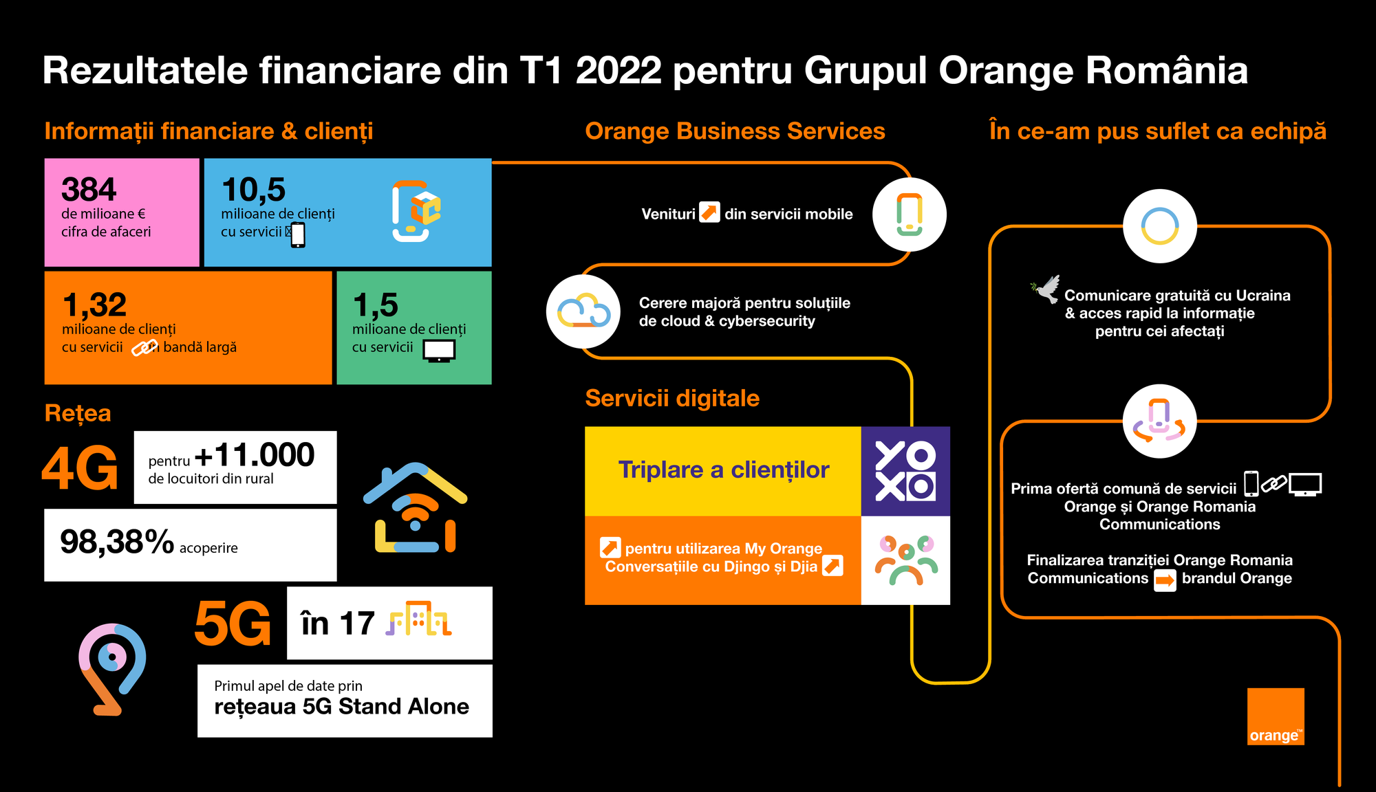 Pe parcursul T1 2022, peste 11.000 de locuitori din 50 de localități din mediul rural au primit acces la conectivitate 4G, procentul de acoperire fiind de 98,38% din populație, în timp ce 89 de noi localități din mediul urban și rural s-au bucurat de avantajele rețelei 4G+, procentul de acoperire atingând 72,48% din populație. În ceea ce privește rețeaua 5G, aceasta este disponibilă astăzi clienților din 17 orașe. Tot în acest trimestru, capacitățile 5G au fost testate cu succes în premieră în laboratorul 5G Orange din România, unde a fost realizat primul apel de date ce folosește nativ doar infrastructura 5G, respectiv rețeaua de tip StandAlone (5G SA), ceea ce permite uRLLC (Ultra-Reliable Low Latency Communications), oferind latență de sub 5ms și capacitate mare de transfer a datelor în partiții dedicate ale rețelei 5G.