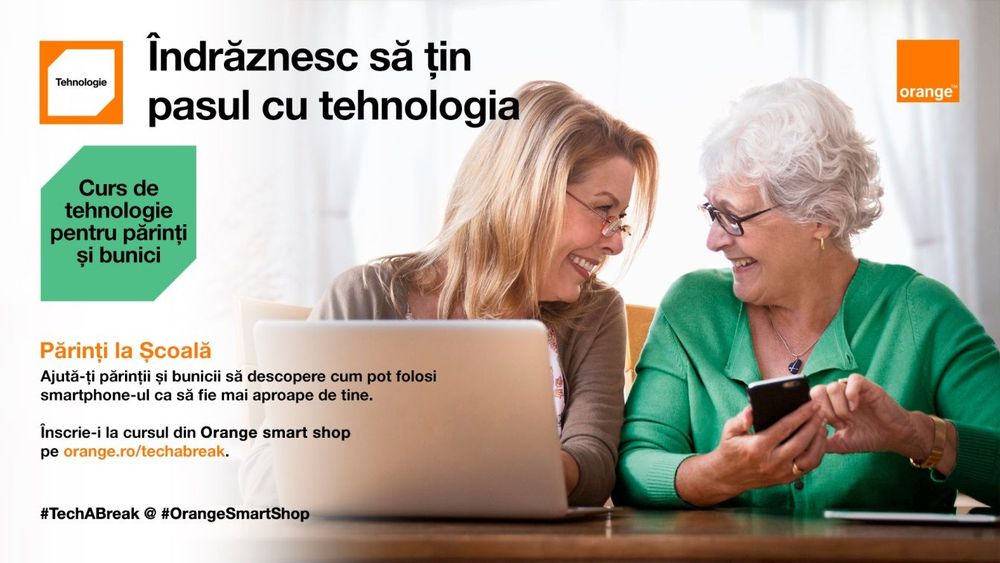 În luna august, Orange deschide înscrierile pentru Părinți la Școală, cursurile de tehnologie pentru părinți și bunici ce se vor desfășura în Orange smart shop în perioada 22-30 august. Cursurile sunt parte a campaniei Tech a Break, prin care magazinele Orange smart shop devin hub de comunicare și învățare pentru întreaga comunitate.